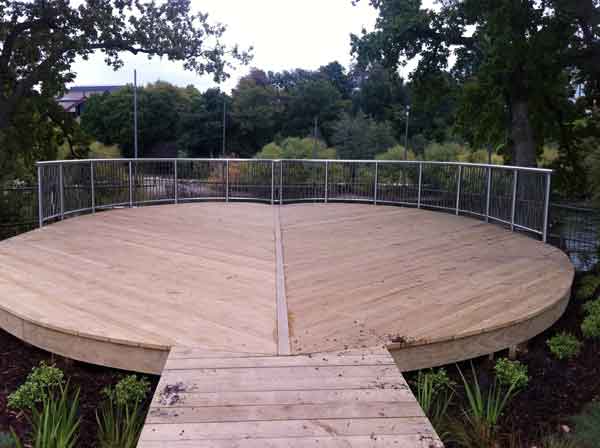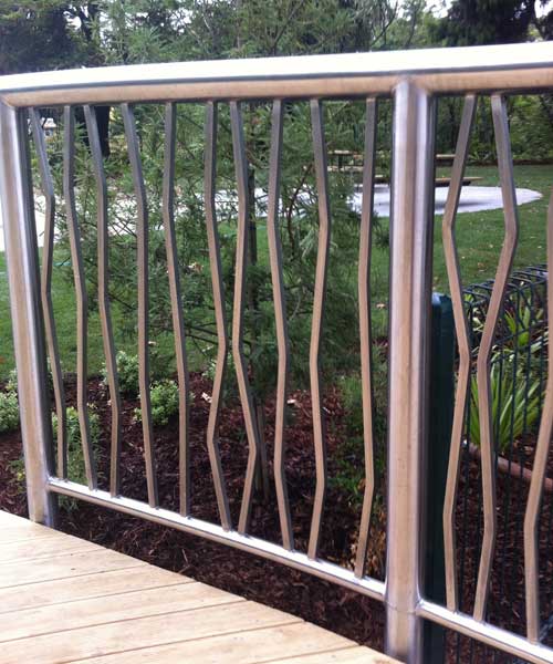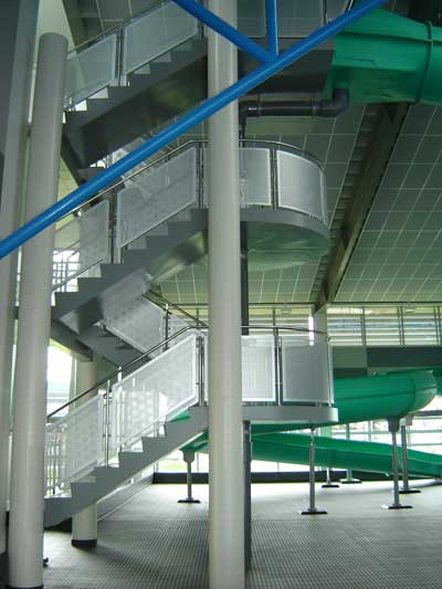 Spiral stainless steel handrail with aluminium balustrade punched infill panels.