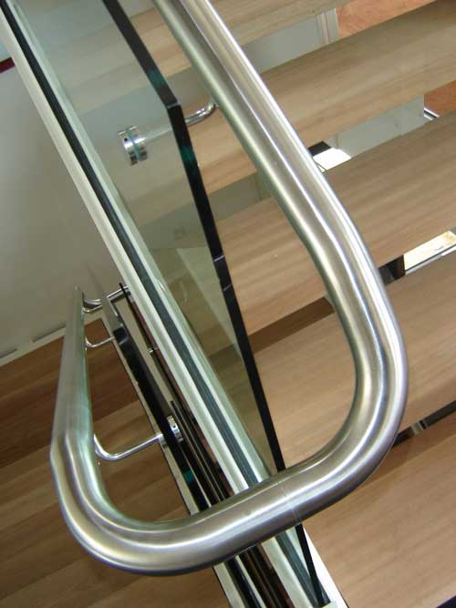 Stainless steel handrail on glass mounted brackets.